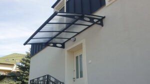 Budapesti kivitelezőnk küldte az alábbi két képet. Egy Herald 2230 bejárati előtető került beépítésre. A Herald 2230 előtető lézervágott, horganyzott acél vázszerkezete minden időjárási helyzetben megállja a helyét. Nem vetemedik, festése pedig nem fakul, mint a műanyag és egyéb kompozit anyagból készült tetők. A polikarbonát tetőpanel UV-álló, így nem fakul meg évek alatt sem.