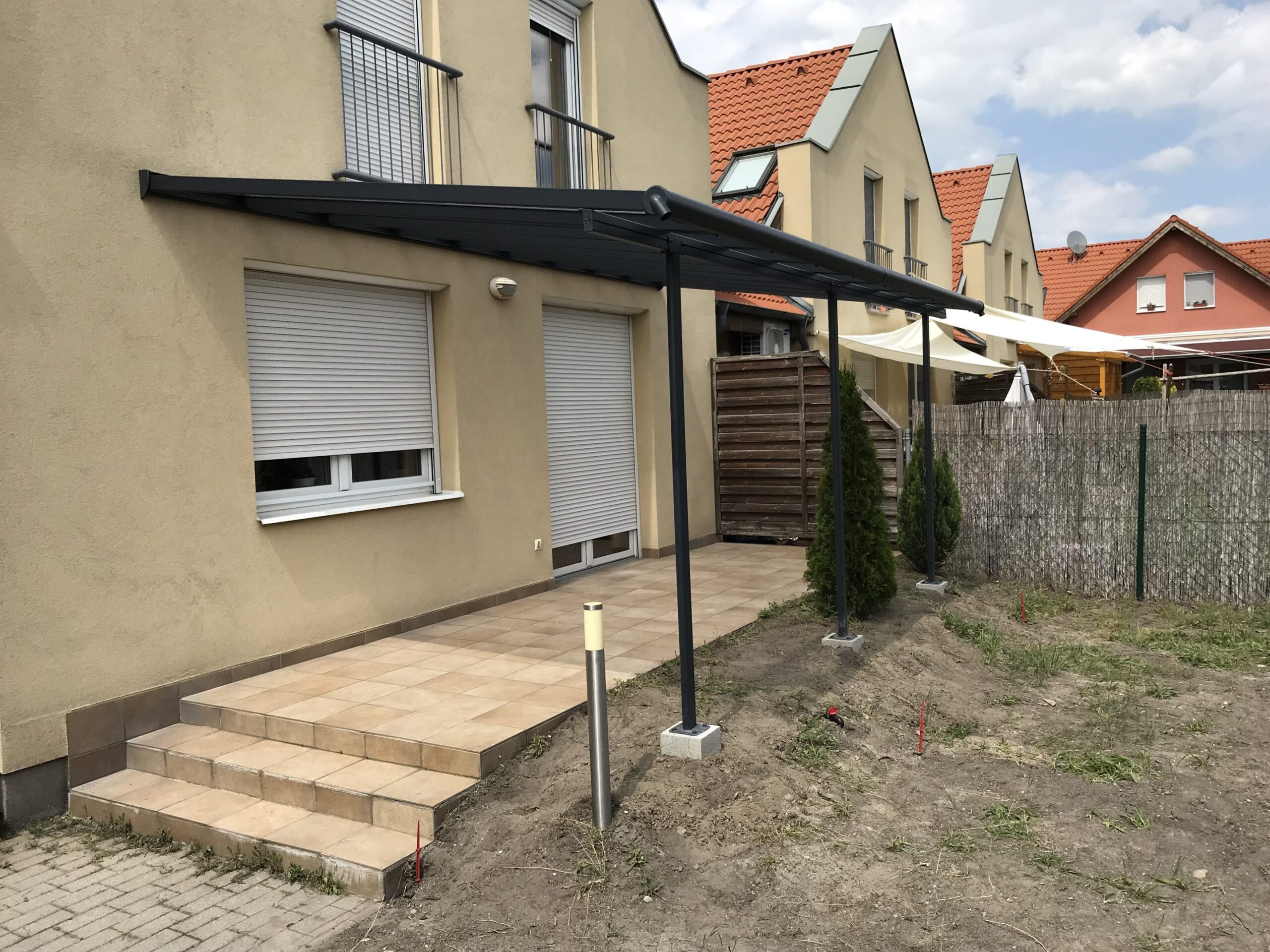 Családi ház udvarának átépítése során került felállításra ez a Sierra 5400-as terasztető. Még vannak vissza munkálatok, de a terasztető már a helyén. Gyorsan, egyszerűen. A tartóoszlopok betontuskói már előre elkészültek az összeszerelési útmutató méretezési rajzai alapján. A rajzok és a betonozás is pontos volt. 🙂