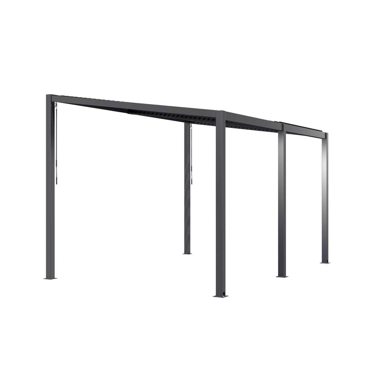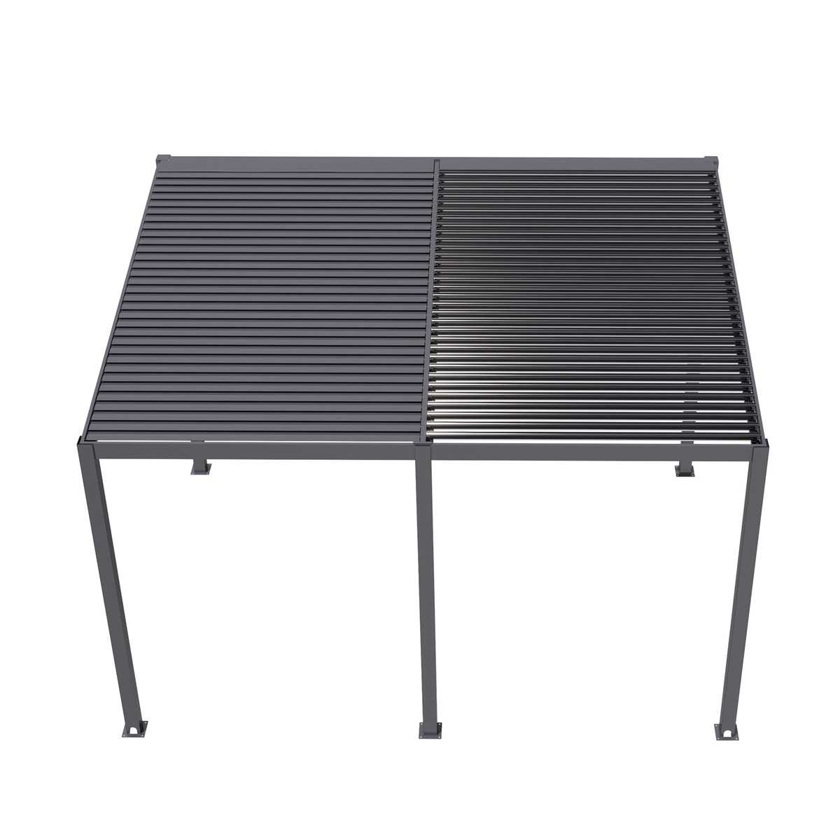 A pergola tetejét 64 alumínium lamella (louvre blades) és két takaróelem alkotja. A lamellák kézzel dönthetők két hajtókar segítségével, így zökkenőmentesen válthat az nyitott és zárt tető között. A kétszekciós tetőrendszernek köszönhetően az egyes részek egymástól függetlenül nyithatók és zárhatók – élvezheti a napsütést az egyik oldalon, miközben a másik árnyékban marad.