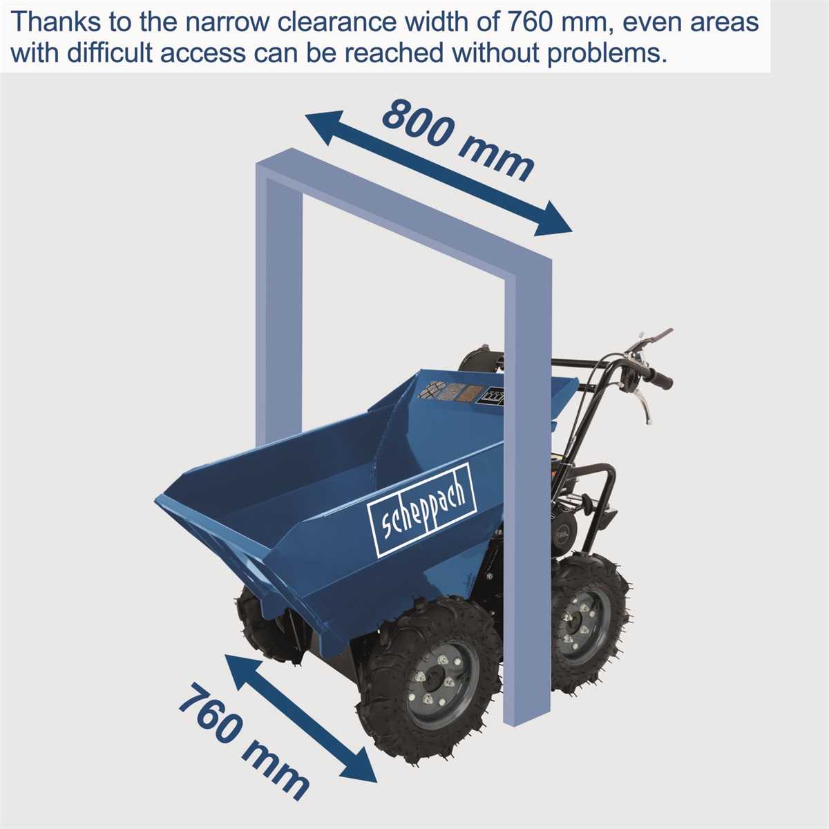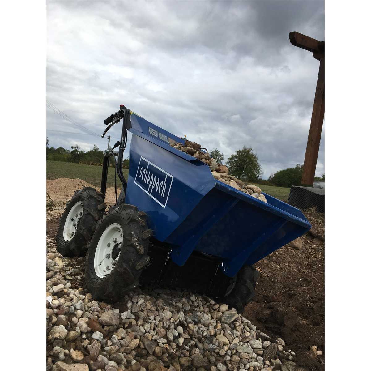 A Scheppach DP 3000 kerekes anyagszállító, nagyon kényelmes szállítási lehetőséget biztosít, akár 300 kg súlyú ömlesztett és szilárd anyagok áthelyezésére, még a nehezebben hozzáférhető helyeken is. Tökéletesen szállítható vele a föld, a homok, a kavics, a kő, a térburkolat, a tégla, de akár a fa és fű is. Széles körben használják az építkezéseknél, a bontási és felújítási munkáknál, az alapozásoknál, a mezőgazdaságban, a kertészetekben, az erdészetekben, stb. Előnye nemcsak a nagyobb biztonság és mozgathatósága a nehezebb terepen is, hanem az elvégzett munka nagyobb hatékonysága a hagyományos manuális szállítóeszközökhöz képest. A négy kerék meghajtás biztosítja a gép kiváló mozgását a nehezebb terepviszonyok között is, továbbá a nagy és széles kerekek elősegítik a gép könnyű kezelhetőségét és a gép alvázvédelmét. A gépet nagyon egyszerűen lehet kezelni. A vezetőkaron lévő fogantyúval könnyen szabályozható a menetirány, a fék automatikusan aktiválódik a kuplungkar felengedésével és a sebességváltókar is elérhető közelségben van a kezelő személy számára. A gép meghajtását a nagyon közkedvelt Loncin motor biztosítja 6,5 LE teljesítményével, amely a legnépszerűbb és legmegbízhatóbb motorok közé tartozik. A gépet 100 x 50 cm-es hólapáttal is ki lehet egészíteni.